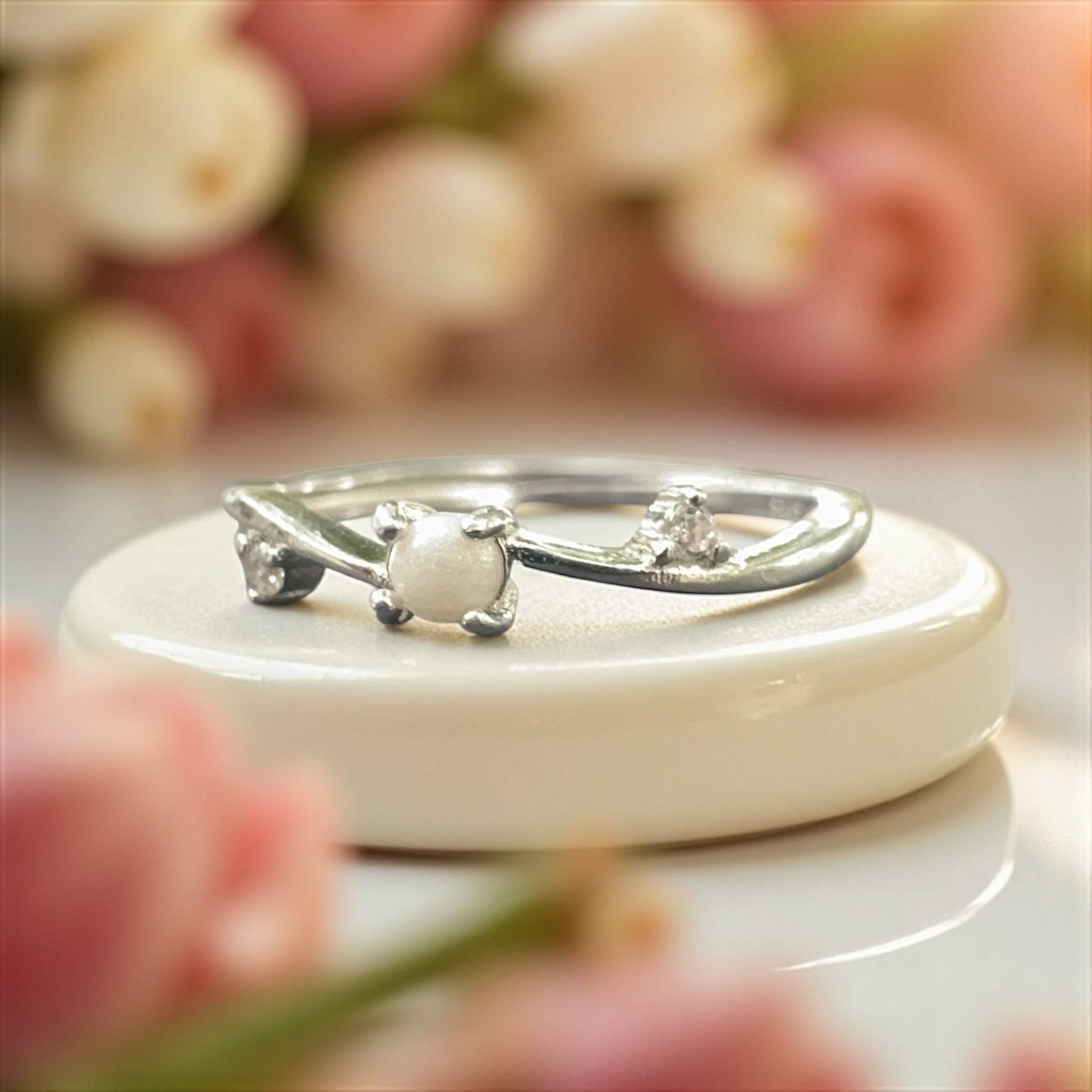 Two shimmering simulated diamonds on each side gently frame the centerpiece, adding just the right touch of sparkle without overpowering the softness of the design.